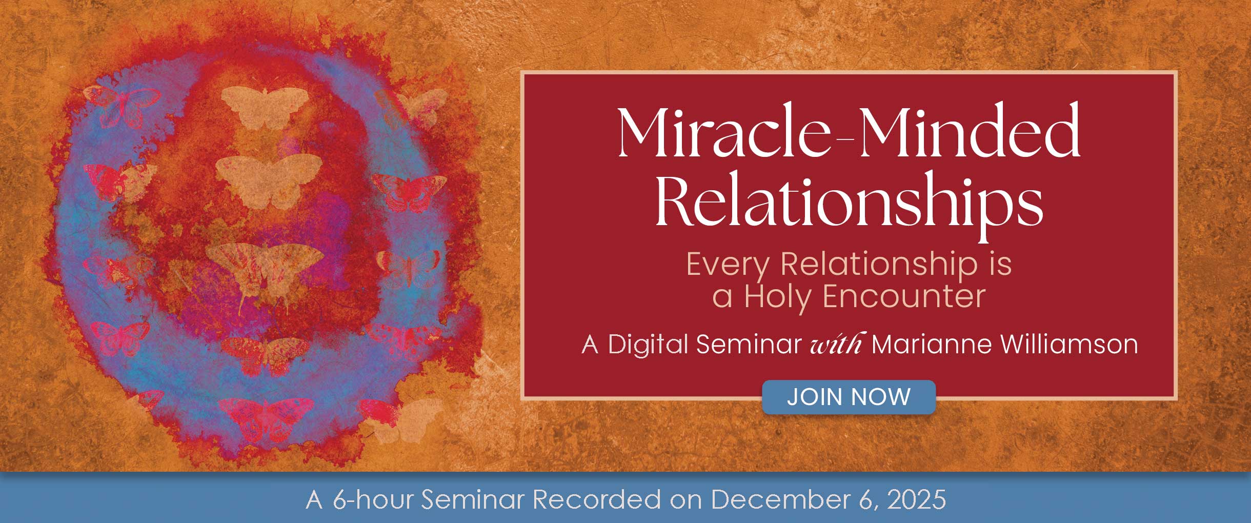 Marianne’s 6-hour seminar is all about cultivating these miraculous connections. From the relationships that are happy and peaceful, to the ones that are difficult and challenging, we’ll allow miracles to replace all grievances and love to replace all fear.